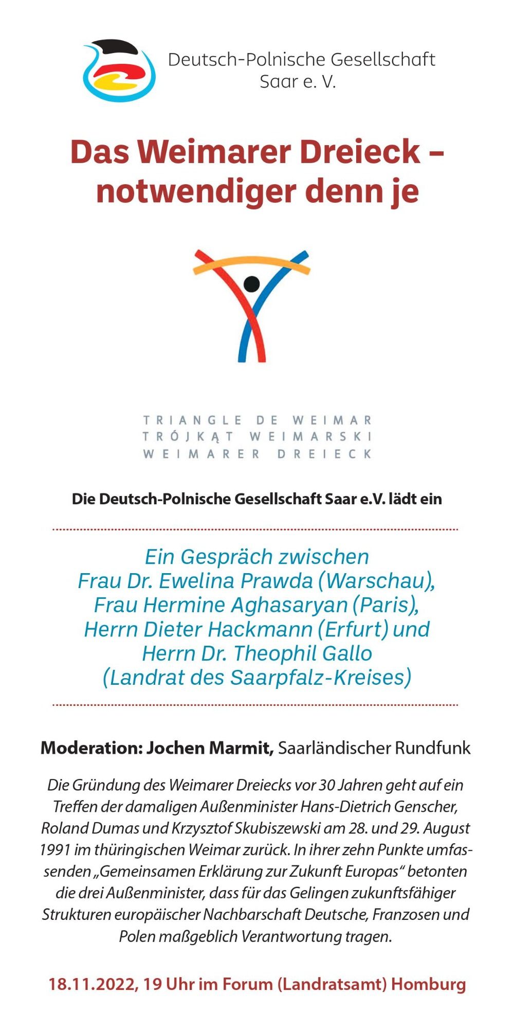 Am 18.11.22 findet im Forum Homburg eine moderierte Gesprächsrunde zum Thema Weimarer Dreieck statt. Zu besseren Planung wird um Anmeldung unter: info@dpg-saar.de gebeten.